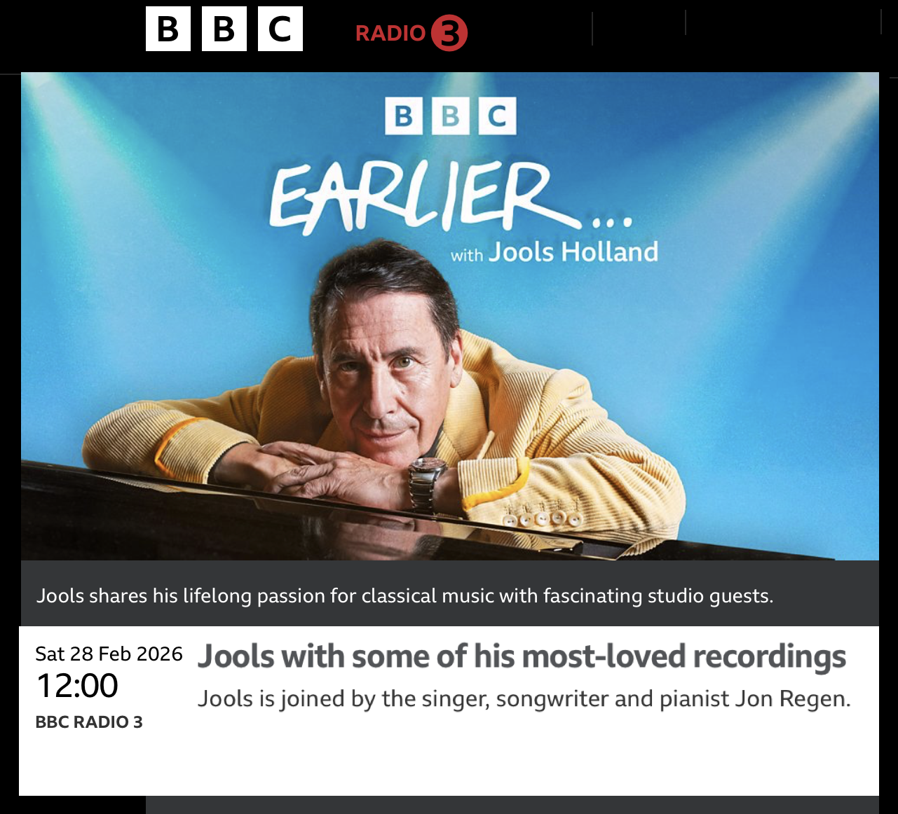 SATURDAY FEB 28! Just an absolute thrill to guest on Earlier... with Jools Holland on BBC Radio 3. Listen live or at https://www.bbc.co.uk/programmes/m002lnjy after it airs. And THANK YOU, JOOLS!