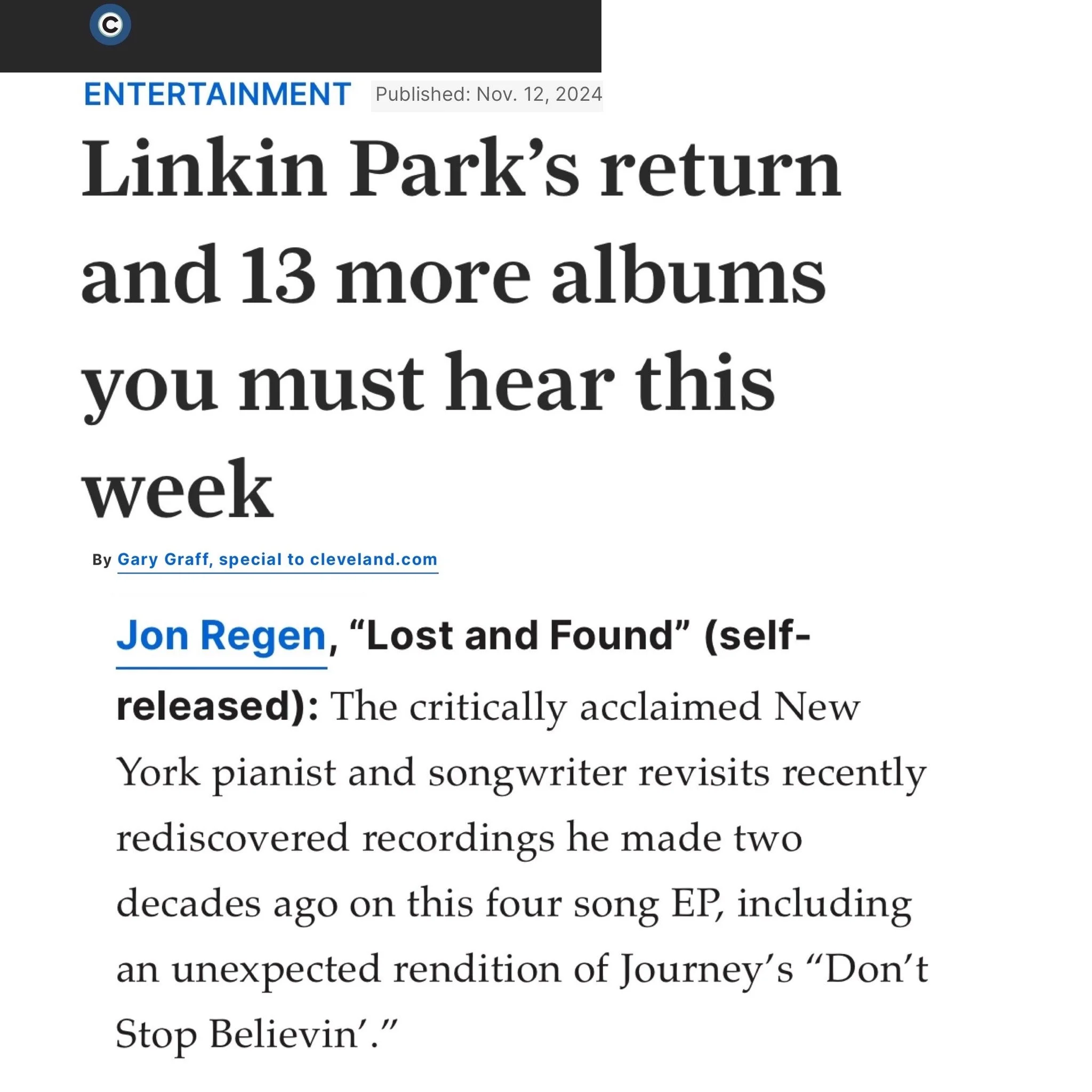 Wow, just waking up to see my new EP "Lost and Found" listed alongside new releases by Linkin Park, Jon Batiste, Gwen Stefani, The Black Keys and St. Vincent. Huge thanks to Gary Graff and Cleveland.com for the nod. I made this album as a bright-eyed kid just chomping to get my music out there. 20 years later, I'm still as excited as ever to play and sing these songs. Proud that this music will finally be out this Friday 11/15. Don't Stop Believin' for real. Pre-Save it at https://hypeddit.com/yxpdmu